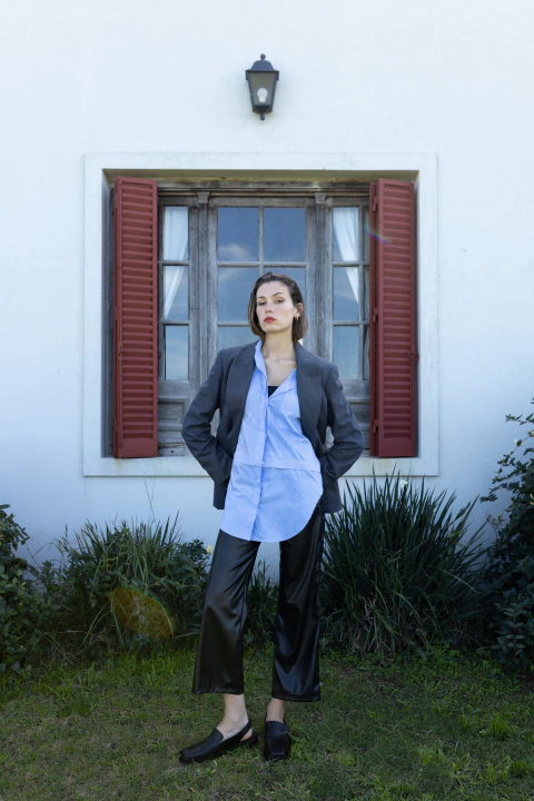 Camisa confeccionada en poplin de algodón. Tiene rayas muy angostas celestes y blancas. Nuestro articulo 2 en 1, ya que posee una cartera de botones horizontales para que puedas usarla corta (a la cadera) o larga (tapa la cola).